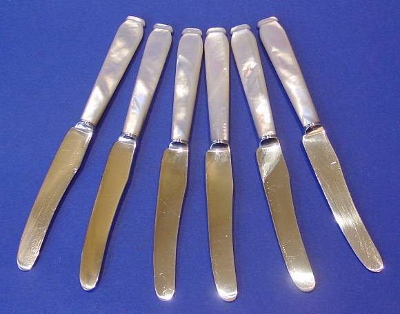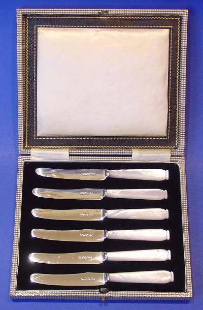 A set of six Art-Deco silver & mother of pearl tea knives in a fitted case.
