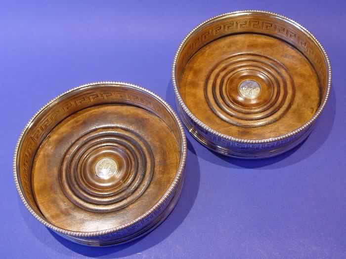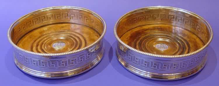 A pair of George III silver wine coasters.