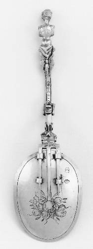 The second is a joined silver spoon/fork with a plain bowl. The stem is surmounted by a man with a beard reaching to his knees. The inscription stating that Claus Joost ordered this spoon to be made in Genoa in 1592.