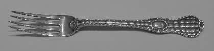 | 118. | Victorian silver dessert fork, London 1856 by Francis Higgins. The pattern is of a basket weave and rope-tied design, similar to the Napier pattern mentioned in Lot109 of the Martin Gubbins Collection sale. L-16.5cm: W-40g. ~ a nice fork and in good condition. Est. £25-35. | £23 |