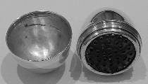 | 144. | George III silver egg shaped Nutmeg Greater, circa 1790 by Samuel Massey. L-3.7cm. ~ only the lid marked with 'SM', a very clean example with good thread. Est. £260-300. | £240 |