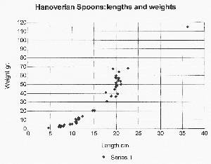 Chart 1 just shows the length (horizontal axis) and weight (vertical axis) in centimetres and grams of a sample of 18th century Hanoverian spoons ranging from miniatures to a single basting spoon. My attempts to collect without undue expense have probably biased the sample towards lighter spoons but it still gives an idea of the range of weights for each size of spoon. The sample covers both of the silver standards and most pattern variations (e.g. rat tail, fancy back etc), but it excludes picture front teaspoons because I felt the heavier stems on many of them to accommodate the decoration made them sufficiently different to justify separate treatment.