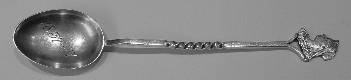 | 5. | Edwardian silver & blue enamel 'The Kendal Seal' teaspoon. Birmingham 1902 by L&S. L-10cm; W-11g. ~ good condition. Est. £15-20. | £12 |