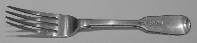 | 43. | Victorian silver Fiddle pattern dessert fork, London 1837 by C.B., engraved on the back 'From E & F Pheni' and initialled 'S'. L-17cm; W-55g. ~ a little unusual as the hallmarks have been struck on the front of the fork, good condition. Est. £55-65. | £45 |