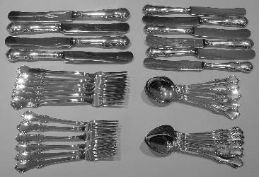| 50. | 34-pieces of Russian silver flatware, circa 1896-1908; 6 table forks, 6 dessert forks, 6 dessert spoons, 6 soup spoons, 4 table knives, 6 dessert knives. Length of table fork 21.5cm; total weight 1163g (37.4oz) excluding knives. ~ the knife blades have probably been replaced at sometime, condition good. Est. £450-550. | £450 |