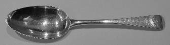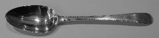 | 57. | Irish silver Bright-Cut Edge Celtic Point pattern tablespoon, Dublin 1781 by James Keating. L-22cm; W-58g. ~ clear marks, good spoon. Est. £55-65. | £50 |
