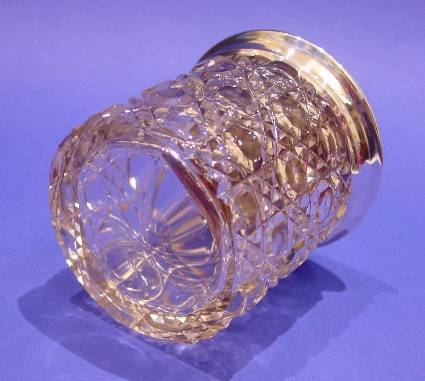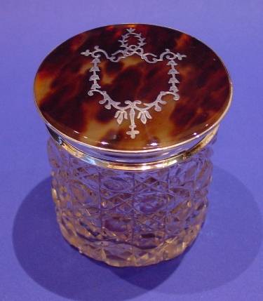 Silver and toroiseshell topped glass pot.