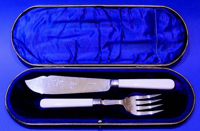 Edwardian silver & ivory fish servers.