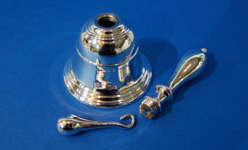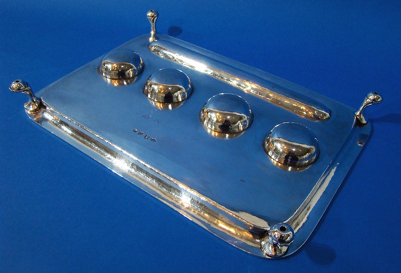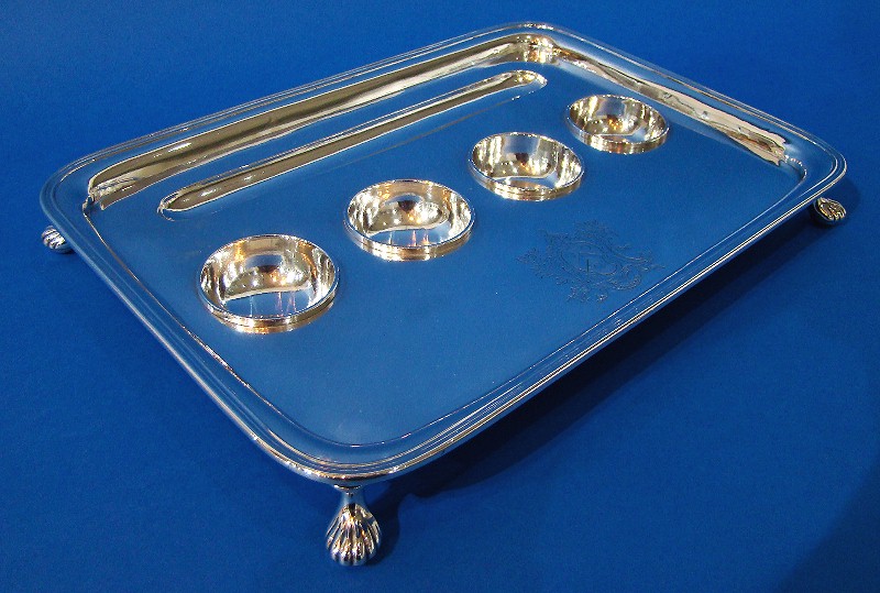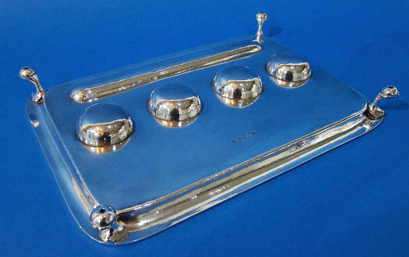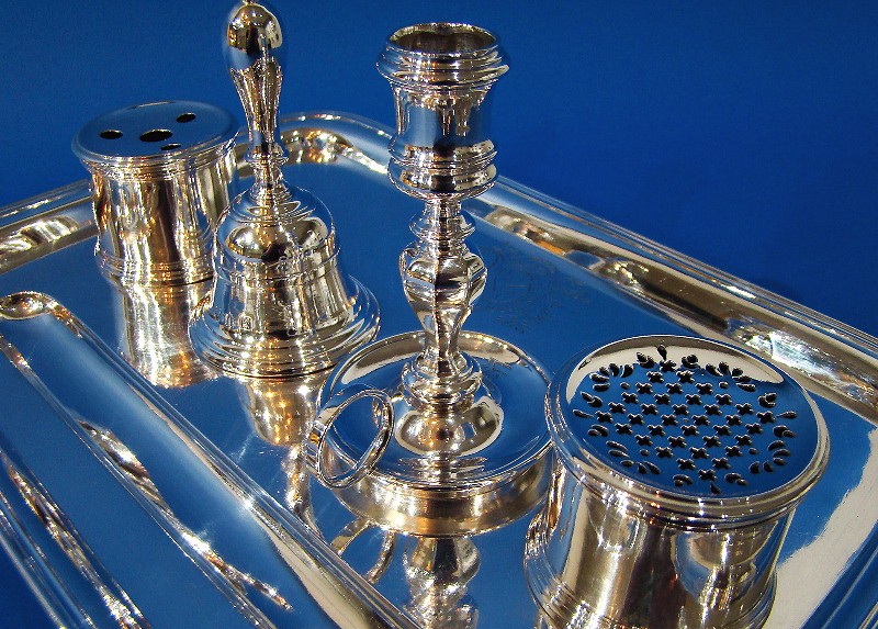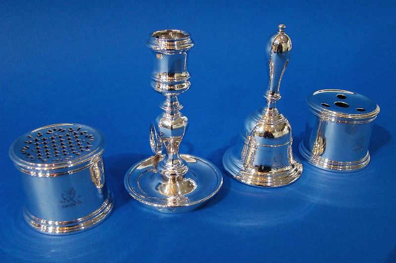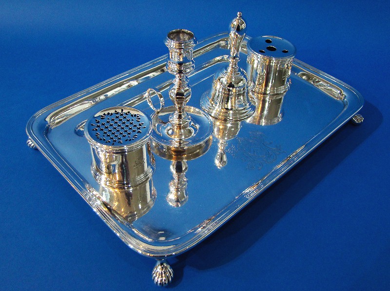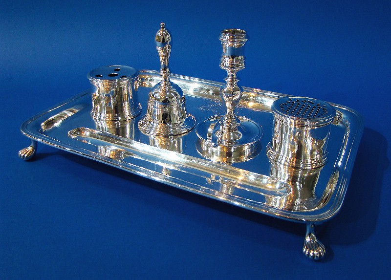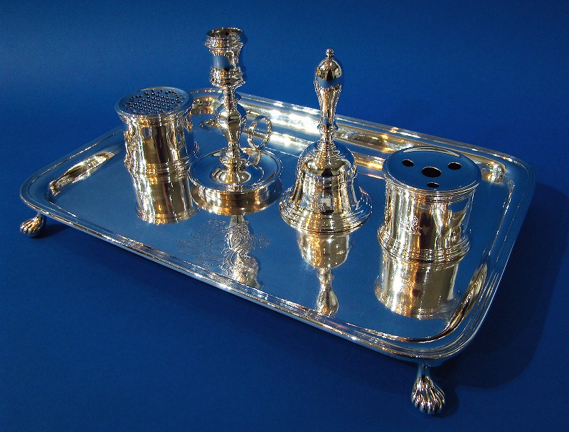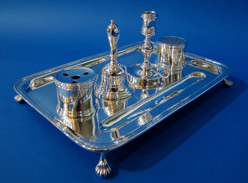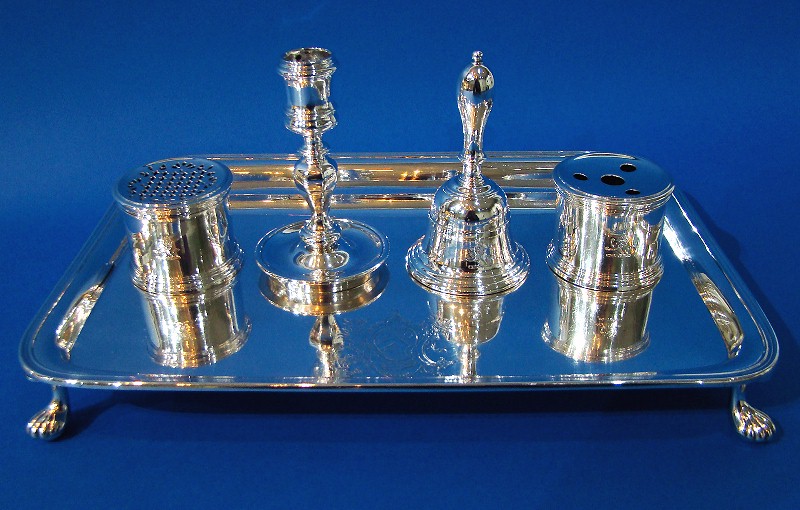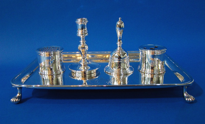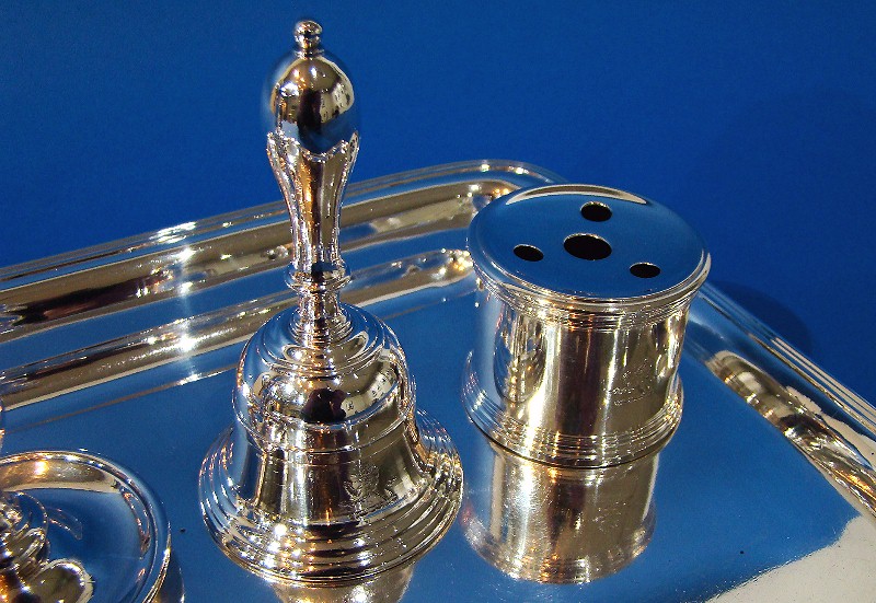 A very rare & superb inkstand with inkwell, table bell, taperstick & pounce pot