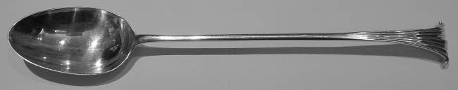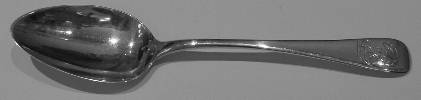 | 141. | Scottish silver Onslow pattern basting spoon, Edinburgh 1773 by William Davie. Contemporary crest on reverse of the finial, a sword erect with a motto 'I DARE'. L-32.5cm; W-90g. ~ The crest & motto belonging to, either the Adair, Dalyell or Dalziell Family. There is a scarf joint which is hard to see, the bowl is good, the marks are good and the Onslow is good, in fact this is a really wonderful spoon and again like the preceding two lots, it has very low reserve. If this does not sell, I will buy it myself! Est. £300-400. | £50 |
