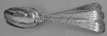 | 149. | 3 Georgian silver Old English bright-cut pattern teaspoons, two London 1805, one 1789, the pair by Peter & William Bateman, the other unreadable. L-12.5cm; W-50g. ~ one bowl with tiny spit, marks worn. Est. £30-35. | £25 |