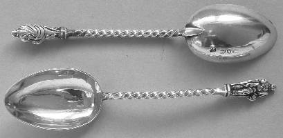 Only ten days after I had despatched the above contribution to our Editor I was at a West Country antiques fair and happened upon two more examples of spoons by George Unite with twisted stems and this distinctive cast finial - the pair of small teaspoons depicted here (Although, at only 11 cm in length, they might be coffee spoons). Their Date Letter is the lower case Gothic 'q' for Birmingham1890/91which reinforces my suggestion that this design was not produced specifically to commemorate the 50th anniversary of Sir Walter Scott's death. However, it does raise the question of what range of spoon sizes George Unite produced in this style? The finials on these tea/coffee spoons are exactly the same size as that on the salt spoon suggesting, perhaps, that only these small spoons will be found in this design but it would be interesting to know if anyone is aware of larger examples or, indeed, other small ones - e.g. other condiment spoons or anything to indicate that both tea and coffee sizes were produced.