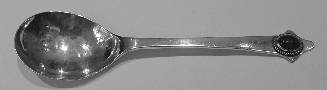 | 41. | Arts & Craft silver spoon with a cabochon green stone and hammered finish bowl, London 1920 by Sybil Dunlop. L-16cm; W-35g. ~ Sybil Dunlop is most often associated as a jewellery designer, a pleasing spoon, good condition. Est. £250-300. | £250 |