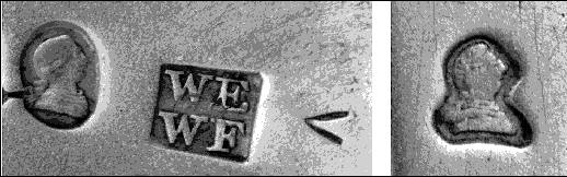 The close-up photographs shown here illustrate well the similarity of the British duty head (on the left) and that on the American spoon by Johnson and Reat described in last month's FINIAL. The curiously shaped outline of the punch is totally unlike any known variation of the English and Scottish duty heads or indeed any other pseudo mark. Any suggestions as to why would be most welcome. (See Lot 52, in this issue's Postal Auction, a different 'American' duty head. Ed.)
