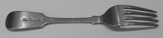 To go back to Sherwoods, just how many versions there were of their plate mark is difficult to say. So far there are those published by Bradbury and Mappin plus another on an electroplated fiddle pattern dessert fork. This item sports a letter 'A', but this time similar to a Sheffield Assay Office Cycle II for 1806/7.