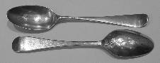 | 72. | Pair of George III Old English pattern with 'Prince of Wales Feather' bright-cut decorated teaspoons, London 1797 by Jonathan Perkins Snr. & Jnr. L-12cm; W-23g. ~ double duty mark, clear marks on one spoon the other rubbed but readable, tiny wear to tip of bowl. Est. £30-40. | £30 |