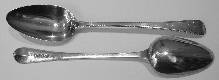 | 76. | Pair of scroll-back Hanoverian pattern tablespoons, London 1760 by 'T*R' (untraced). L-21.3m; W-124g. ~ very good marks, scrolls and bowls. Est. £220-260. | £220 |