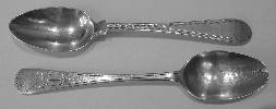 | 143. | 2 bright-cut teaspoons. One, O.E. pattern, maker's mark only 'I.Q'; the other transitional O.E. with shoulders by William Parsons, Exeter, c.1800; L-12cm; W-21g. ~ the Exeter spoon is in good condition, the other a bit chewed. Est. £35-45. | £25 |