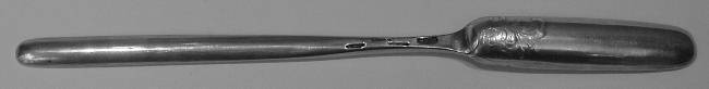 | 145. | George III silver scroll-back marrow scoop, London c.1770 by William Stephenson. L-22.3cm; W-48g. ~ a rare marrow scoop, condition and gauge good, marks squashed, scroll pretty good, a reasonable reserve. Est. £180-220. | £160 |